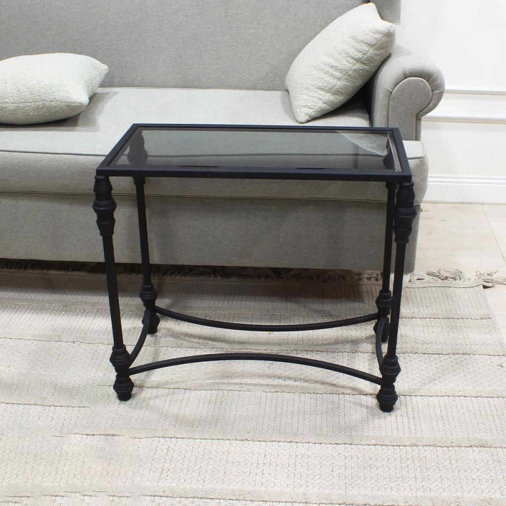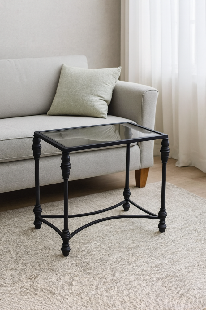 طاولة خدمة حديد زجاج شفاف تتكون عادة من قاعدة مصنوعة من الحديد مع تصميم عصري وجميل، أما سطح الطاولة فهو مصنوع من الزجاج الشفاف. يتميز التصميم بتوازن بين القوة الجمالية والعملية، حيث يظهر الزجاج الشفاف رونقًا عصريًا بينما يمنح الحديد القاعدة الثبات والمتانة.