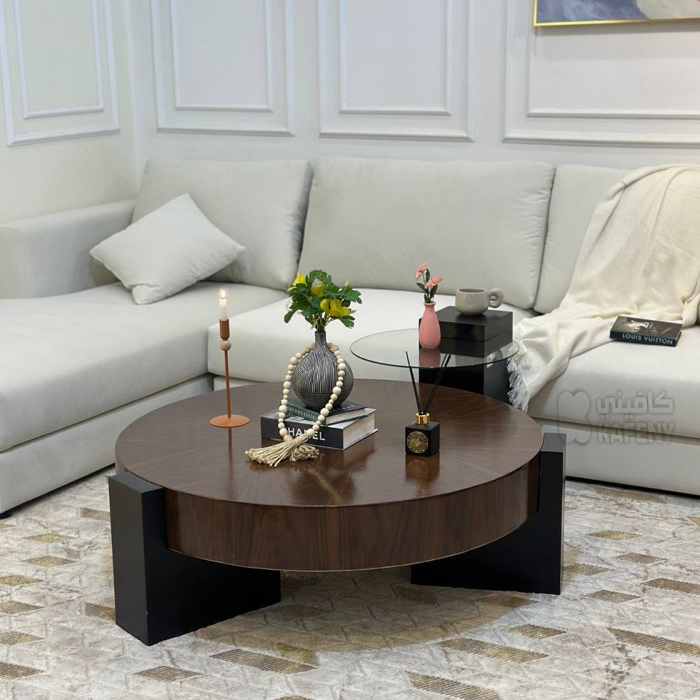 طاولة قهوة مستديرة مع طاولة جانبيه ، من الألواح الخشبية ، تقنية رائعة لقشرة الخشب الصلب ، نسيج خشبي طبيعي مقعر ومحدب ، نسيج واضح ،مقاوم للخدش ، طاولة جانبية من زجاج مقسى ، والطاولة الكبيرة من قشرة جوز مستوردة ، قاعدة الطاولة من الفولاذ الصلب