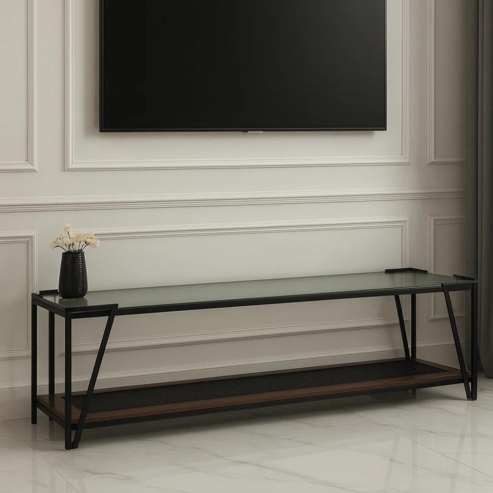 طاولة بلازما فاخرة بتصميم عصري وأنيق، تأتي بدورين لتجمع بين الجمال العملي والفخامة. مصنوعة من الخشب البني الفاخر الذي يمنحها مظهراً دافئاً وطابعاً كلاسيكياً راقياً، مع سطح علوي من الزجاج الشفاف يضفي لمسة من الفخامة والرقي ويبرز تفاصيل التصميم بدقة.