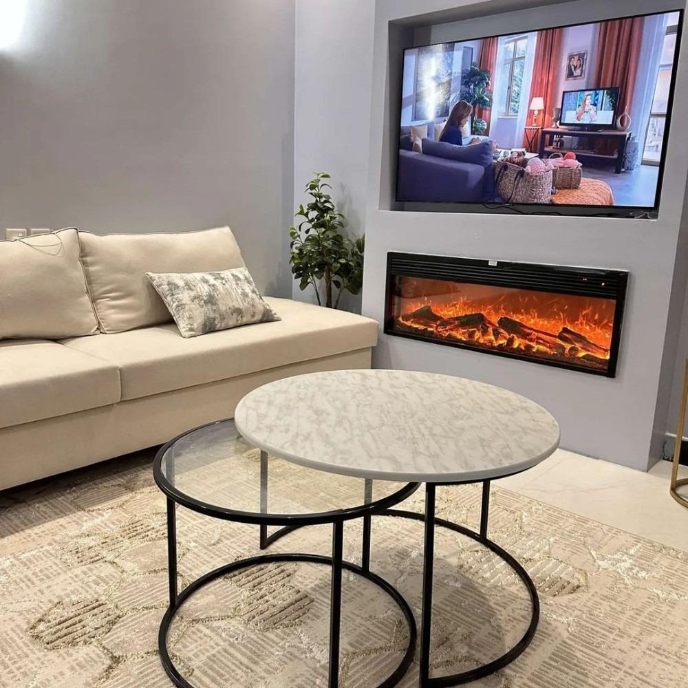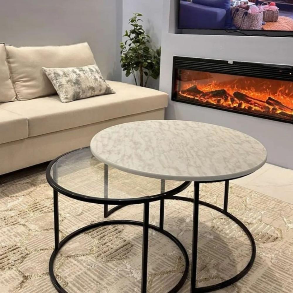 طقم طاولتين ضيافة متداخلة حديد أسود سطح خشب أبيض مع سطح زجاج شفاف #عروض_اليوم_الوطني_95