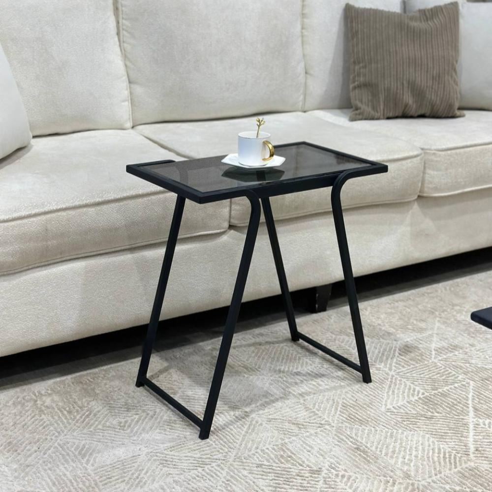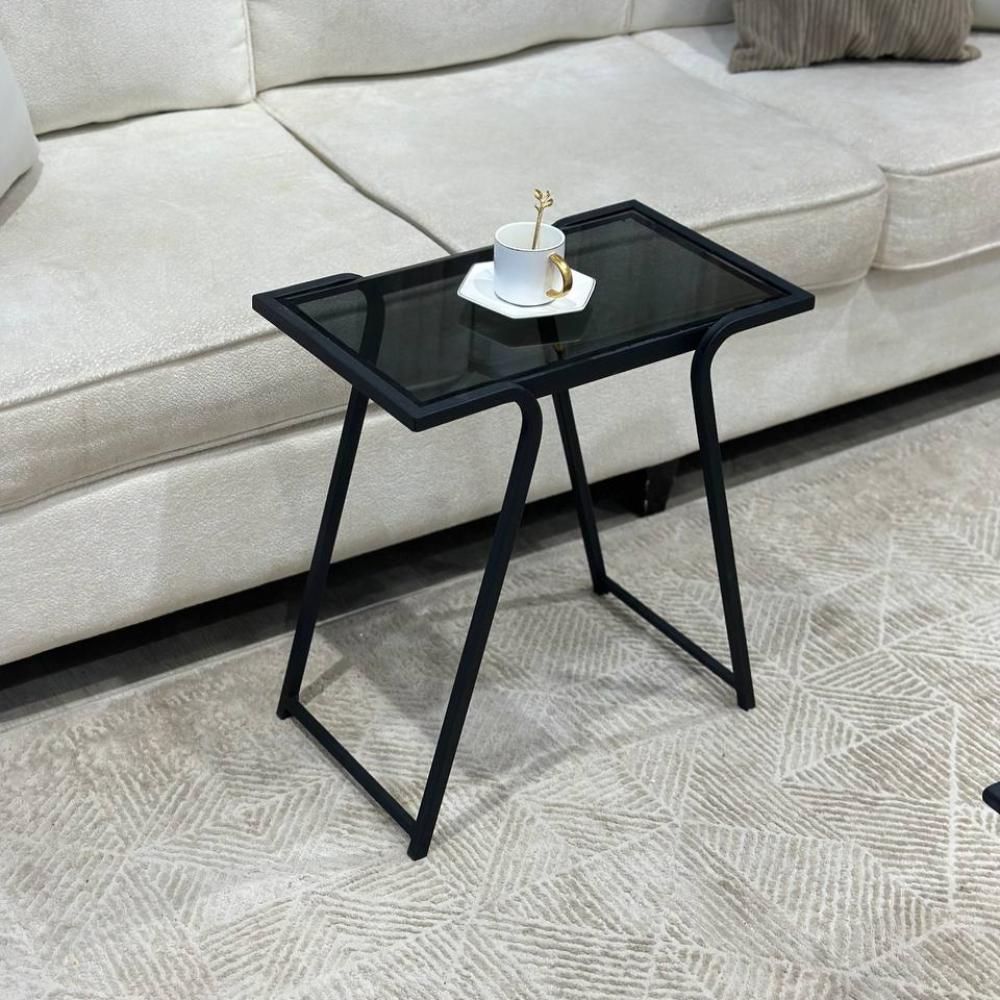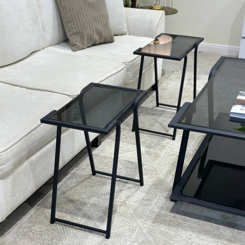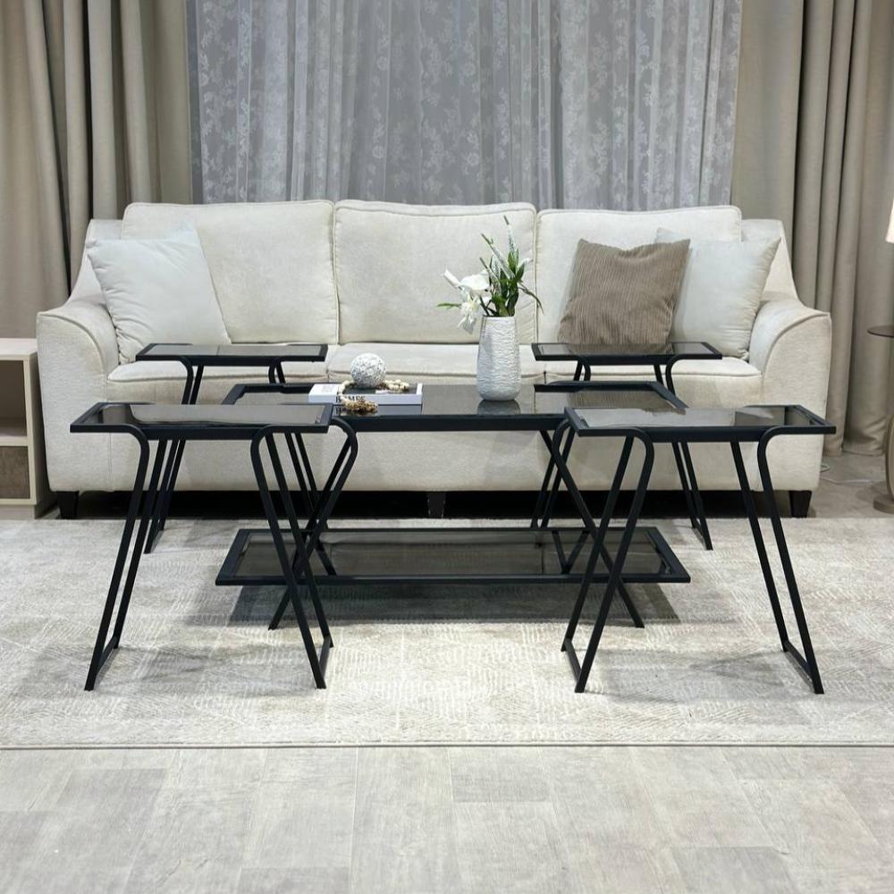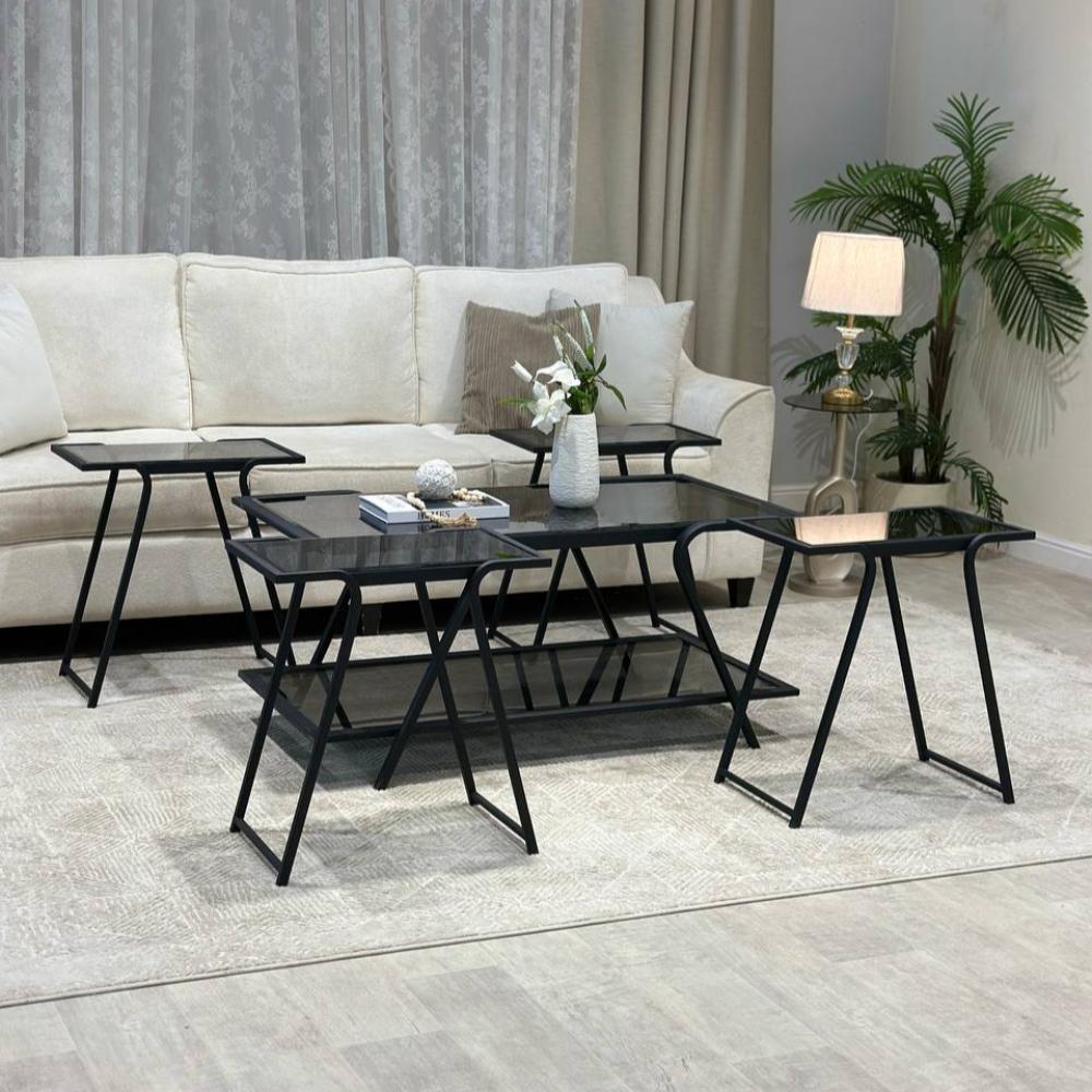 طاولة ضيافة دورين لون أسود سطح زجاج أسود شفاف مع 4 طاولات خدمة - بتصميم انيق وفاخر :