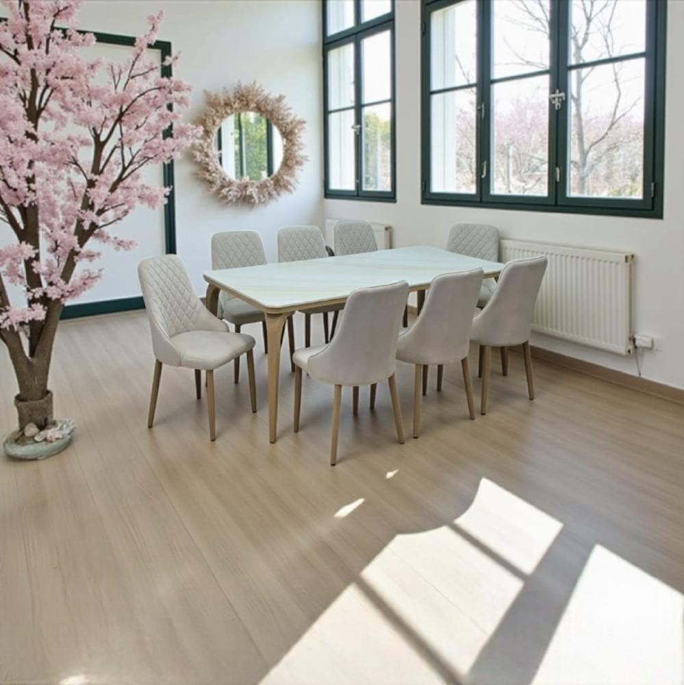 - 8 كراسي مريحة بتنجيد مخملي فاخر بلون بيج هادئ يتناسب مع مختلف الديكورات.