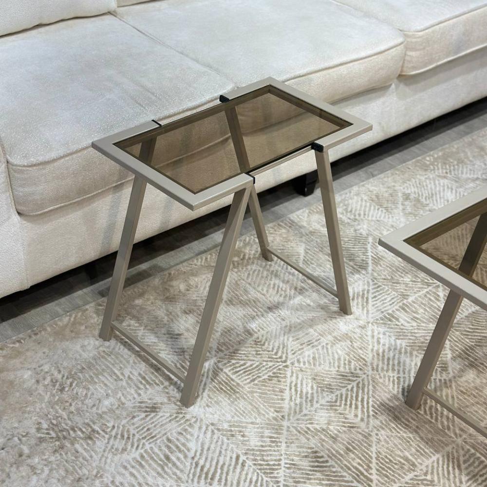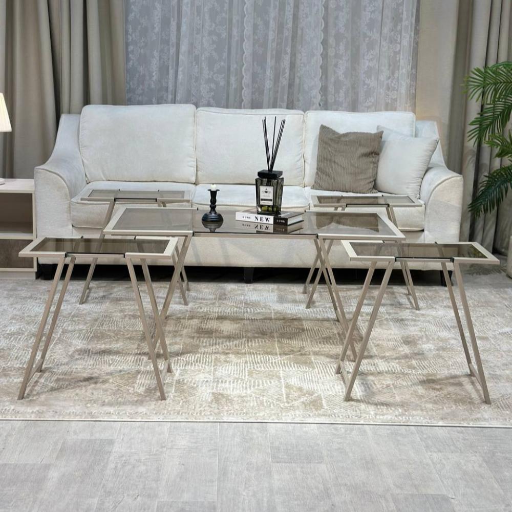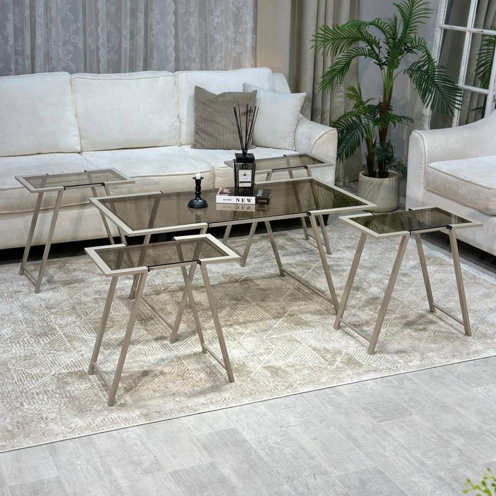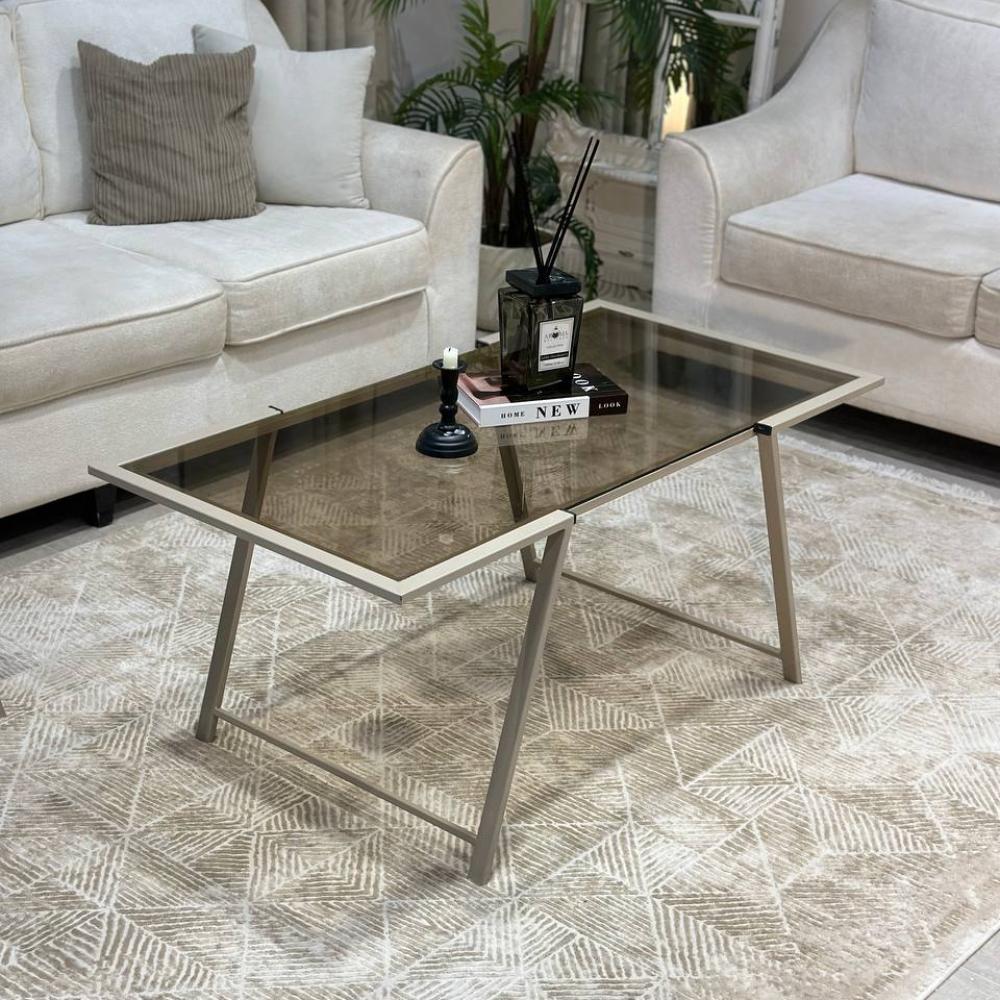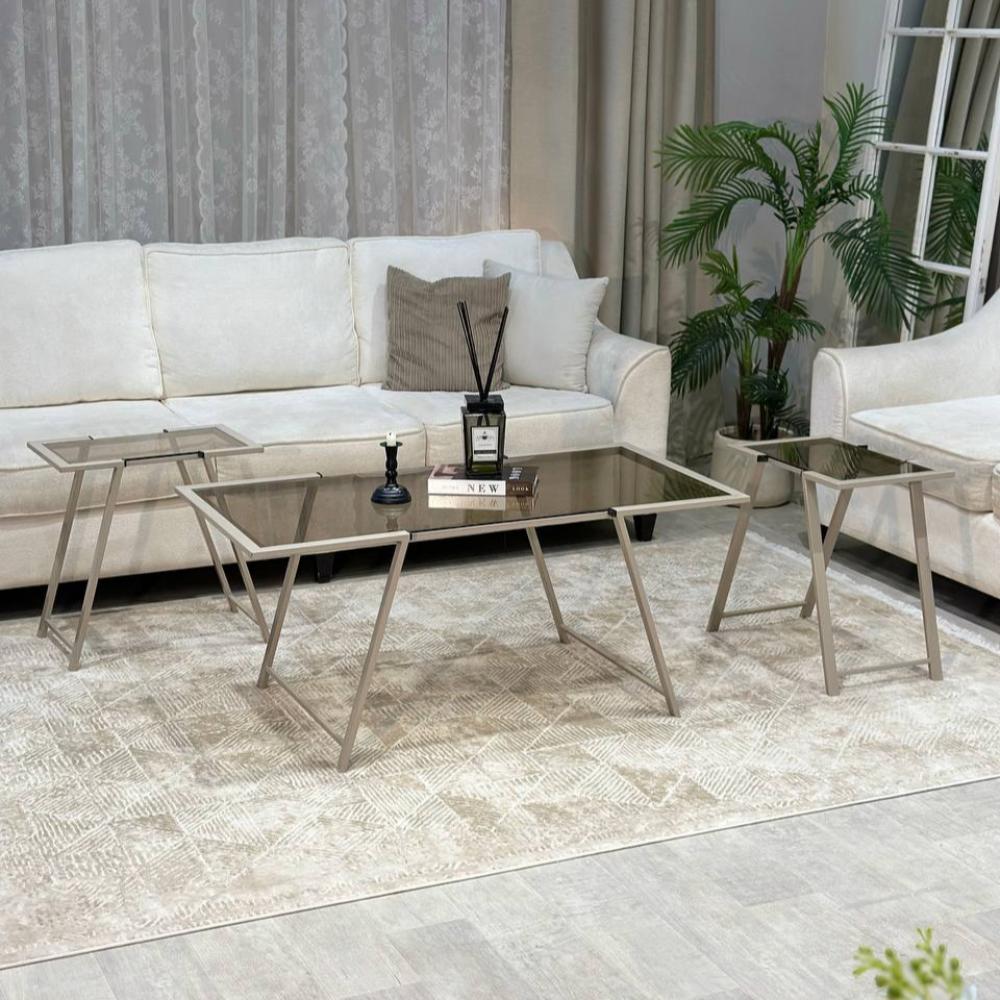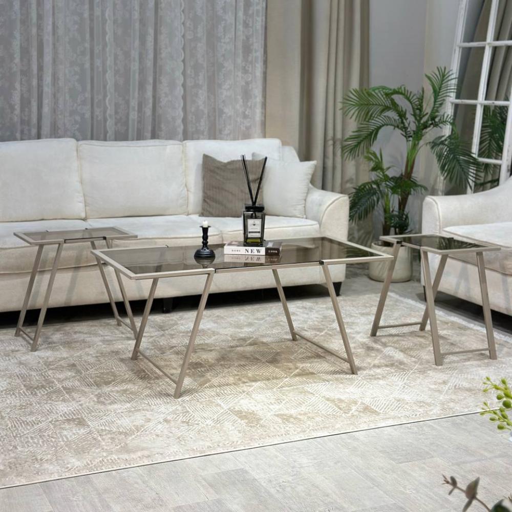طقم طاولات شمباني أنيق بسطح زجاجي بني شفاف ولمسات معدنية فاخرة أضف لمسة من الرقي والعصرية إلى منزلك مع طقم الطاولات الفاخر المصنوع من المعدن المتين باللون الشمباني الأنيق، والمزود بسطح زجاجي باللون البني العسلي الشفاف ، ليمنحك مظهرًا جذابًا يناسب مختلف أنماط الديكور.