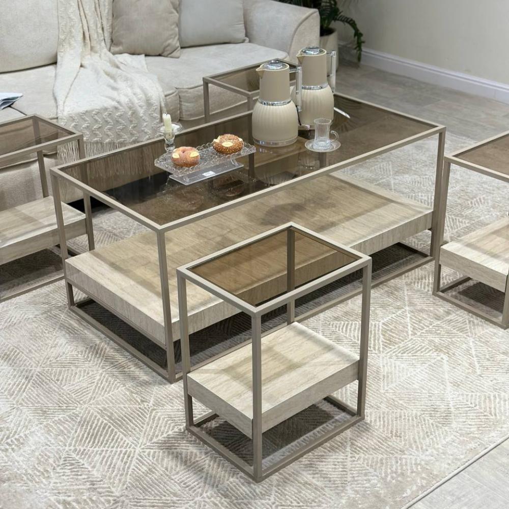 طقم طاولات ضيافة فاخر بتصميم أنيق يجمع بين الفخامة والعملية، مكوّن من طاولات بدورين بسطح زجاج بني شفاف فاخر يضيف لمسة من الرقي إلى أي مساحة. القاعدة مصنوعة من الحديد باللون الشمباني المتين لتعكس مظهراً عصرياً أنيقاً مع قوة تحمل عالية، بينما يضيف تصميم بديل الرخام لمسة فخمة تزيد من جمالية المكان.