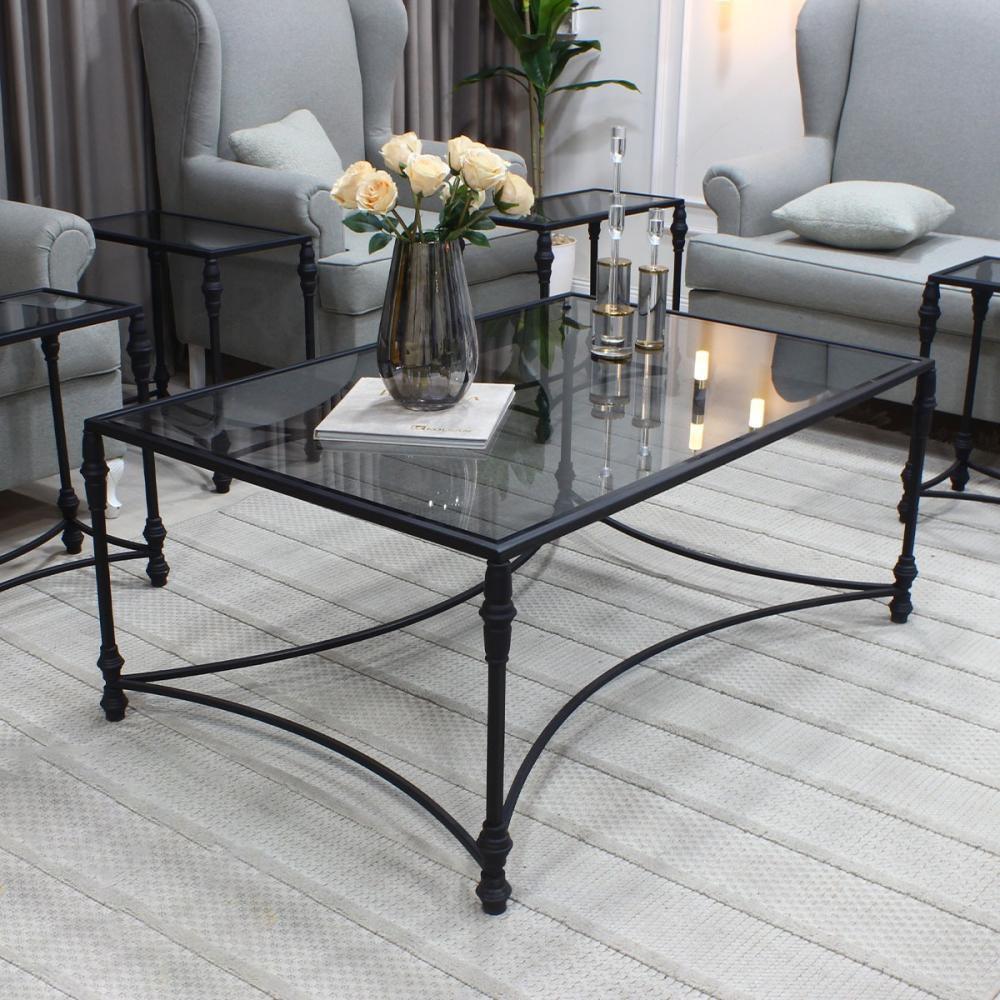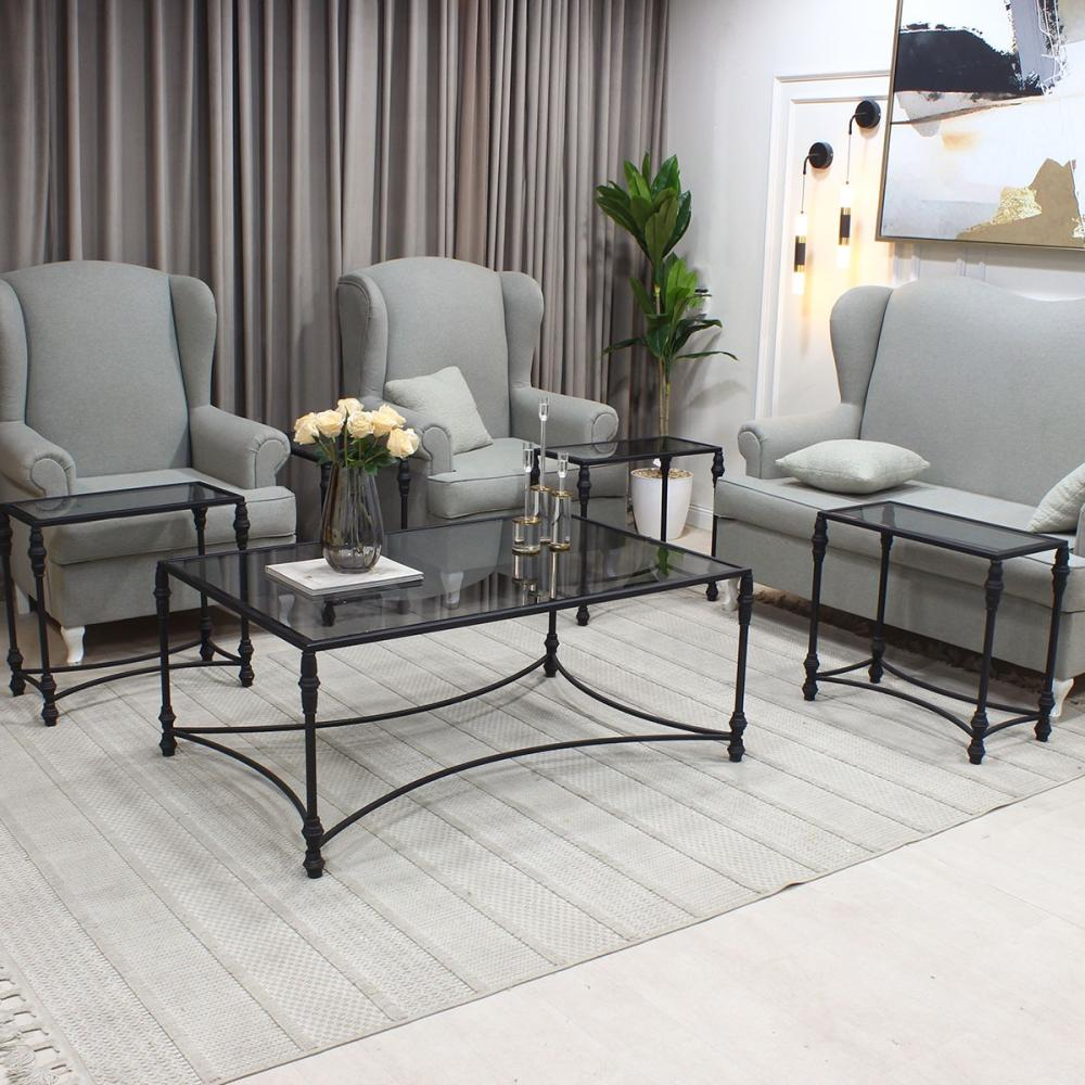 - الطاولات مزودة بأسطح زجاجية شفافة مع إطارات معدنية باللون الأسود تضيف مظهرًا عصريًا ومتناسقًا.