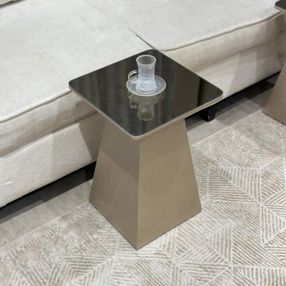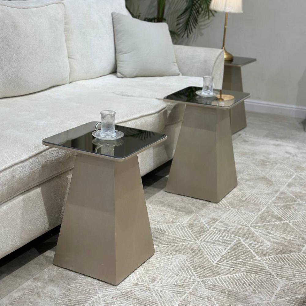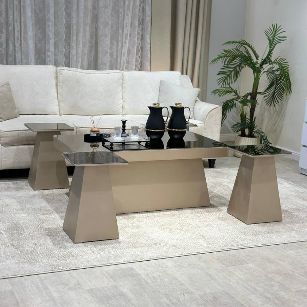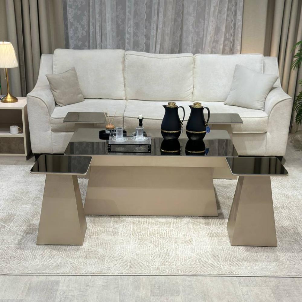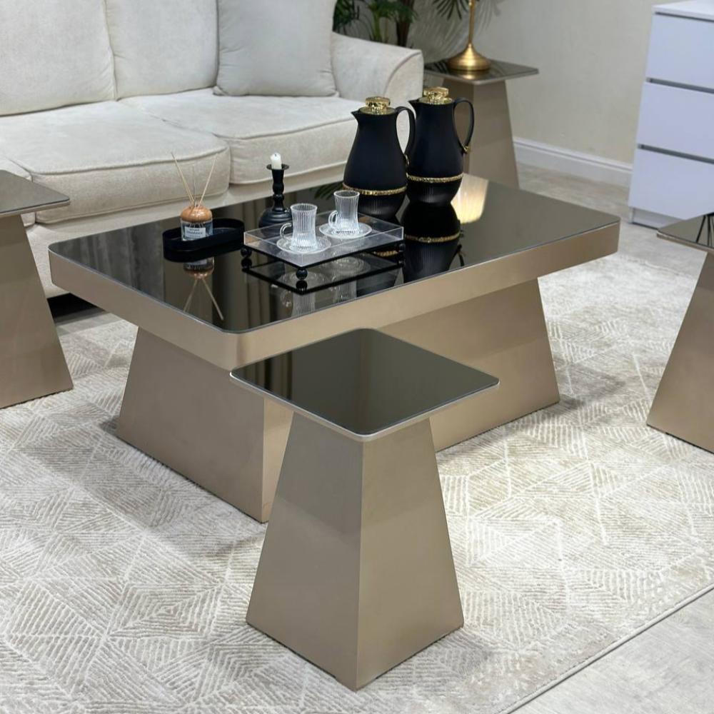 طقم طاولة ضيافة بتصميم فاخر يجمع بين الأناقة العصرية واللمسة الكلاسيكية، مكون من طاولة رئيسية بتصميم كنب بقاعدة خشب شمباني متين وسطح زجاج مرايا عاكس يضفي فخامة على المكان، بالإضافة إلى 4 طاولات خدمة عملية يمكن استخدامها بشكل منفصل أو متداخل لتوفير مرونة في الاستخدام.