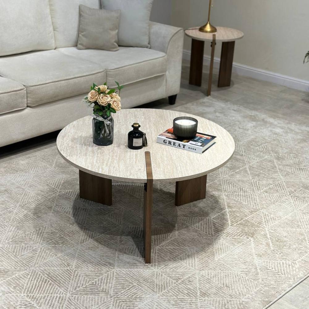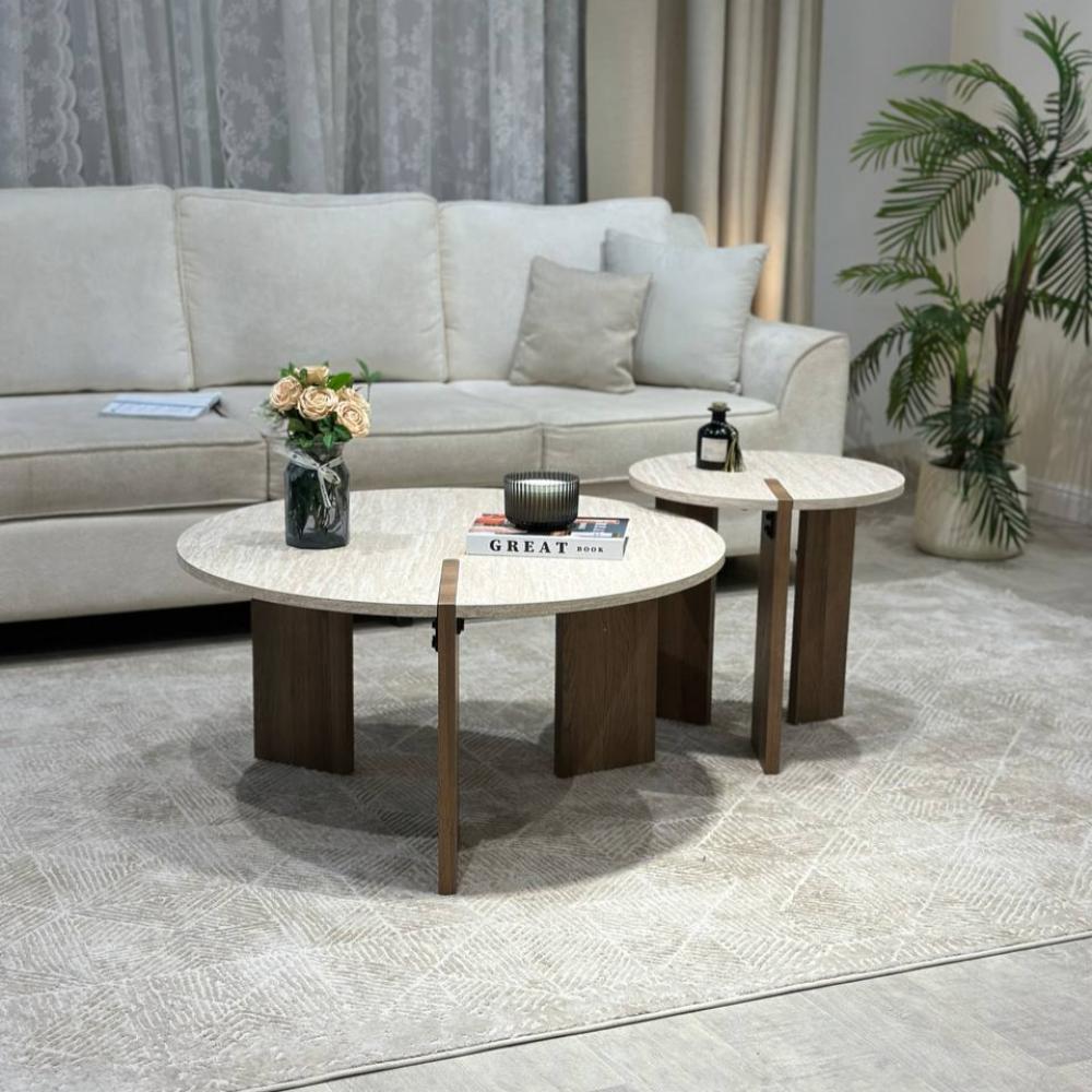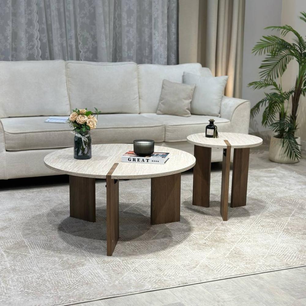 طقم طاولتين بتصميم أنيق يجمع بين فخامة مظهر الرخام وجمال الخشب الطبيعي، حيث يأتي السطح بخامة خشب شبيه الرخام ليمنح لمسة عصرية وفاخرة، مع قاعدة قوية بلون بني تضيف دفئًا وأناقة للمكان. تصميم متداخل عملي يوفر مرونة في الاستخدام وتوفير للمساحة.