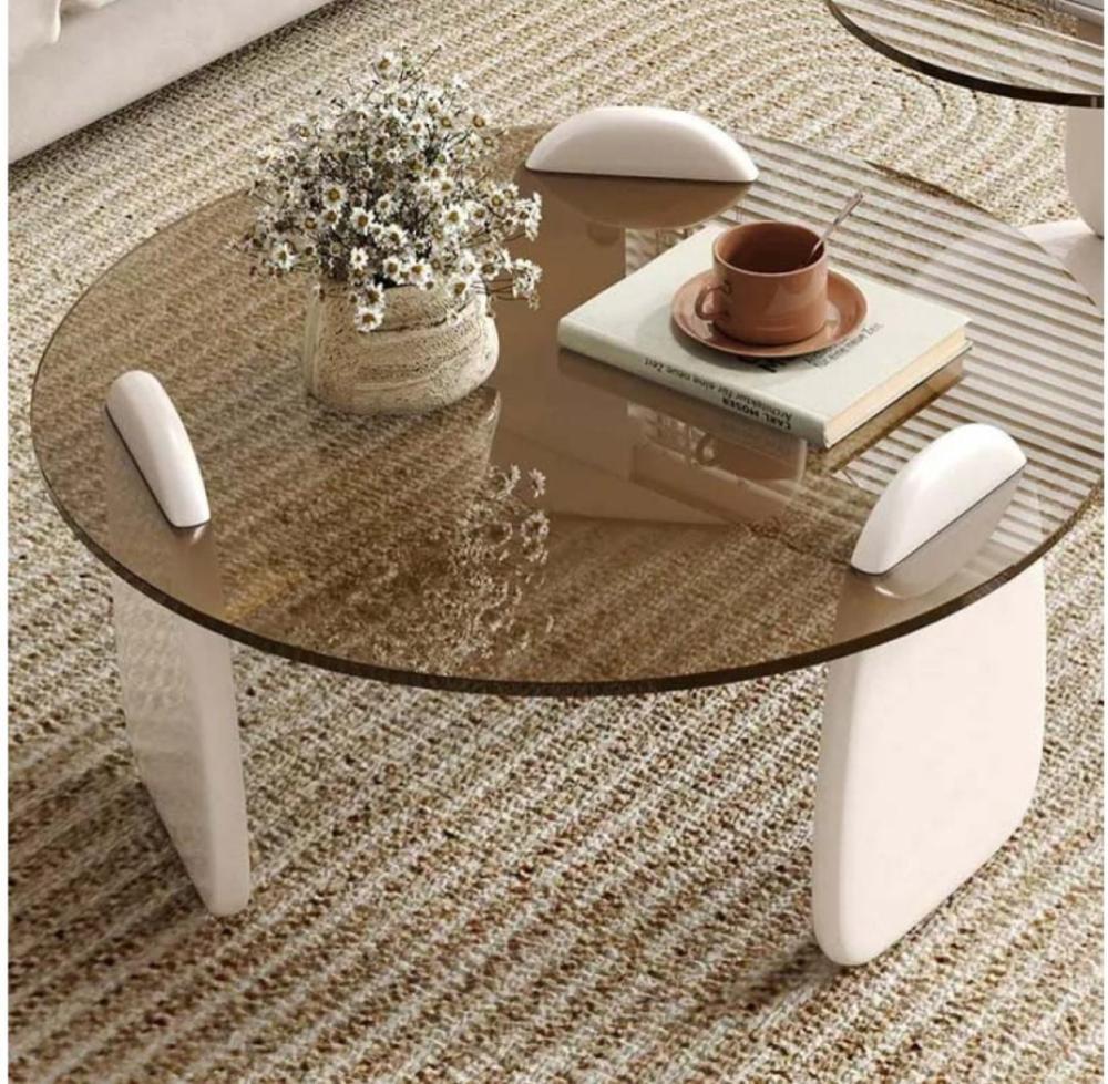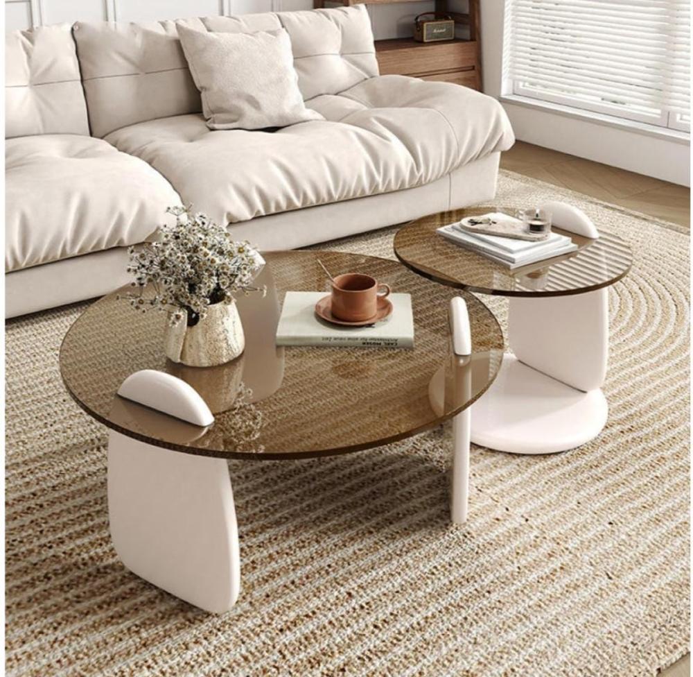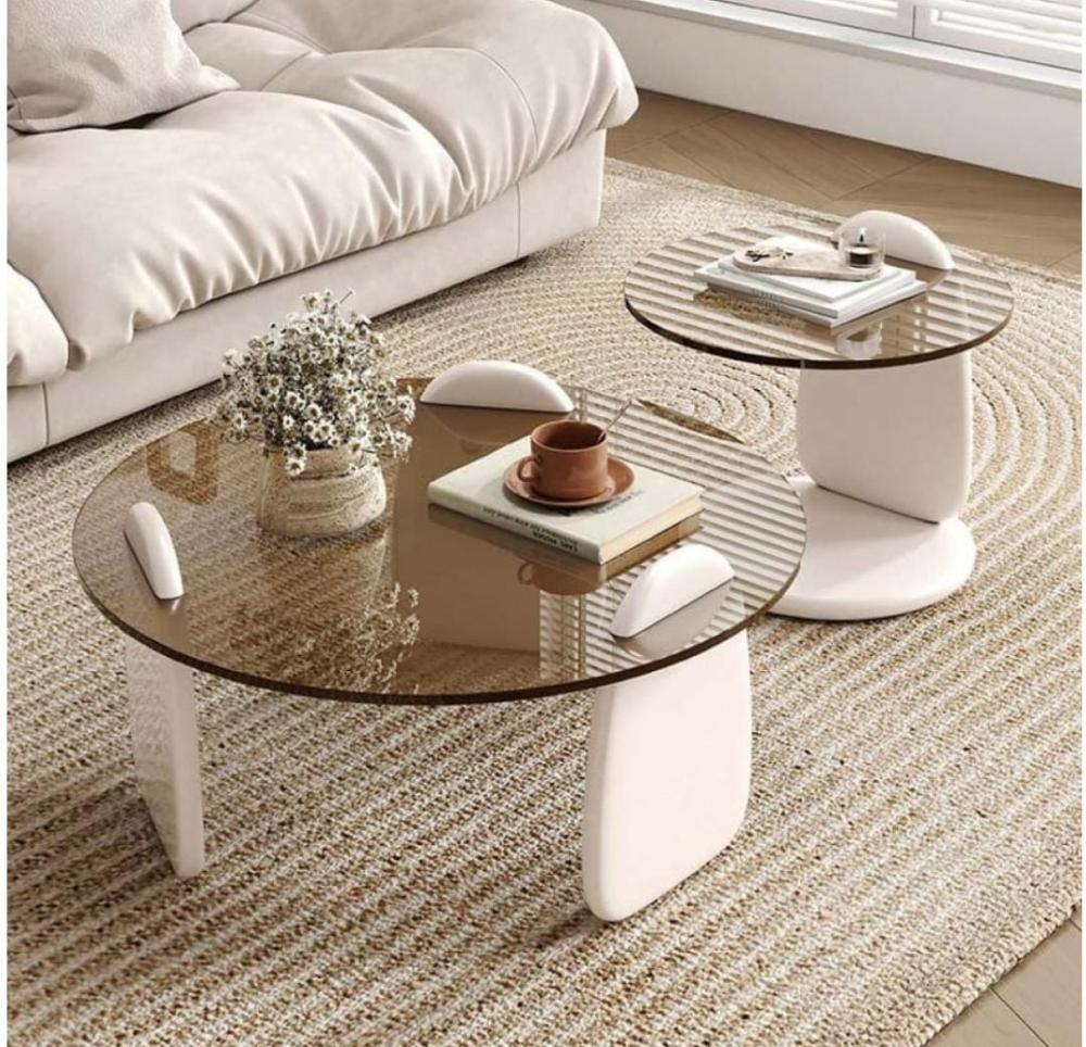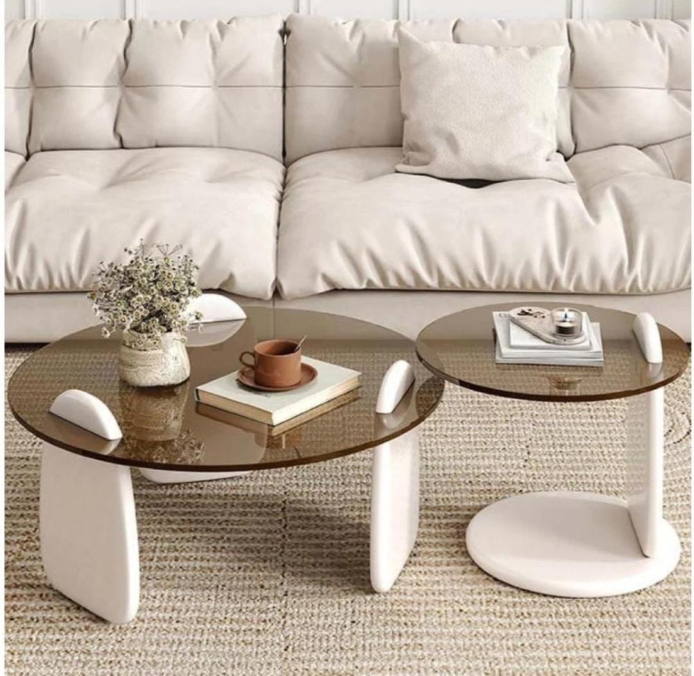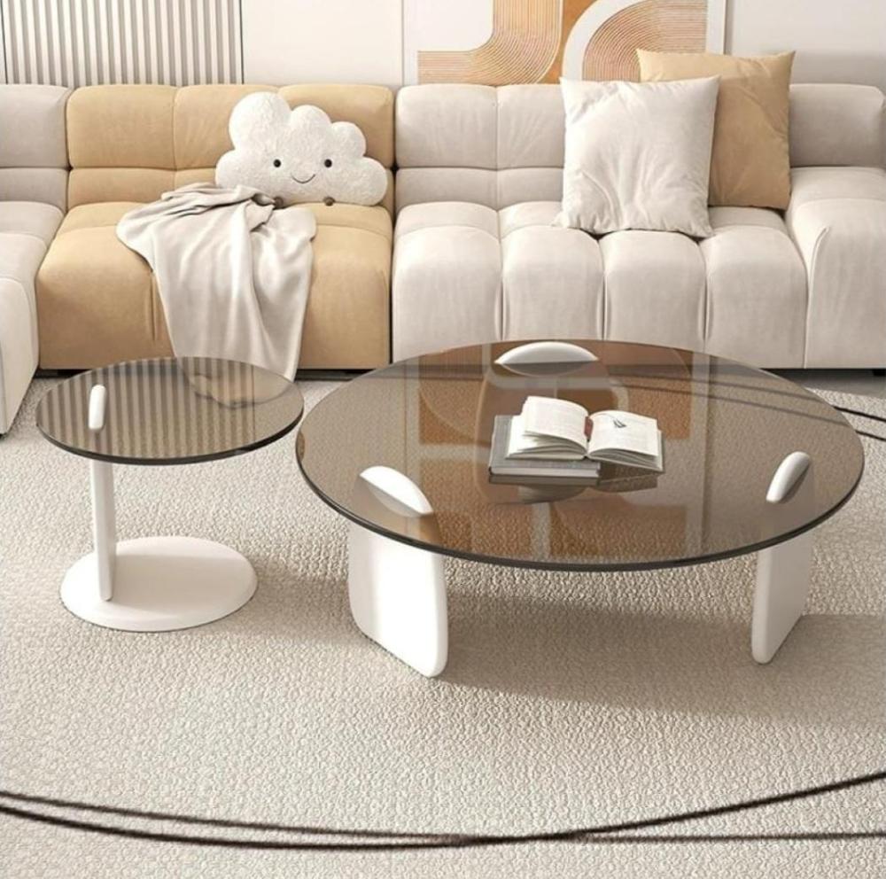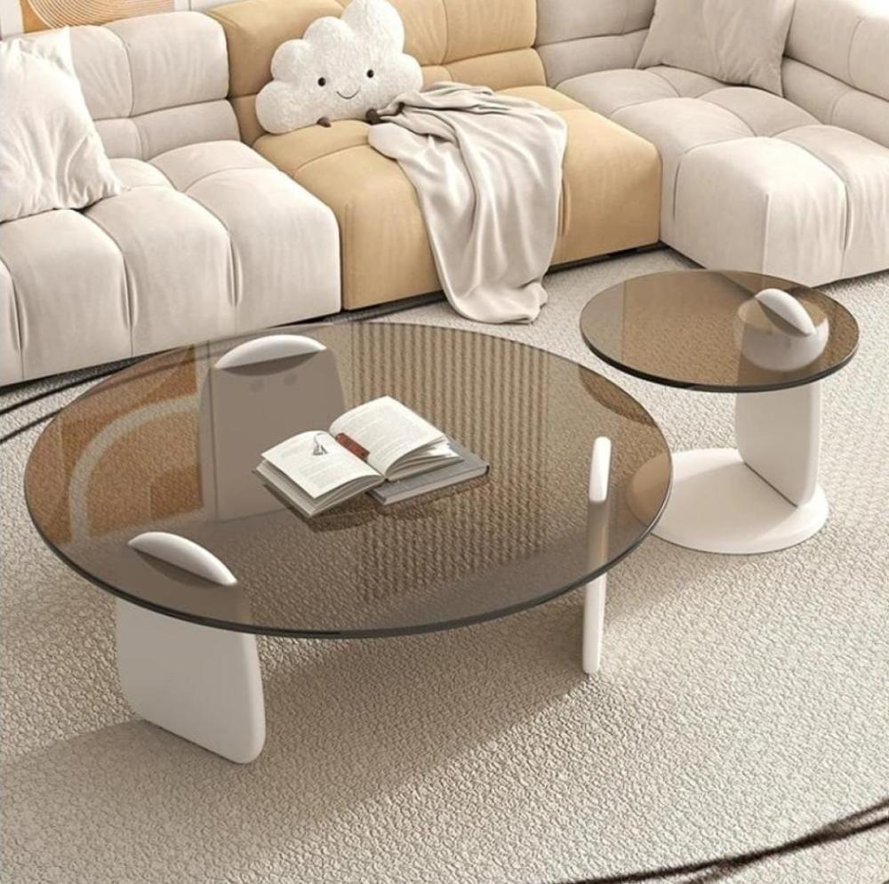طقم طاولتين ضيافة خشب أبيض سطح زجاج دائري بني شفاف - بتصميم أنيق