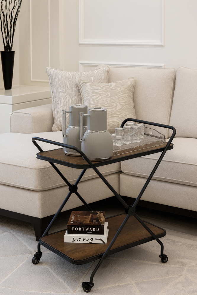 - دورين عمليين: يوفر مستويين لعرض وتقديم المشروبات أو الحلويات أو أدوات الضيافة بشكل منظم وجذاب.
