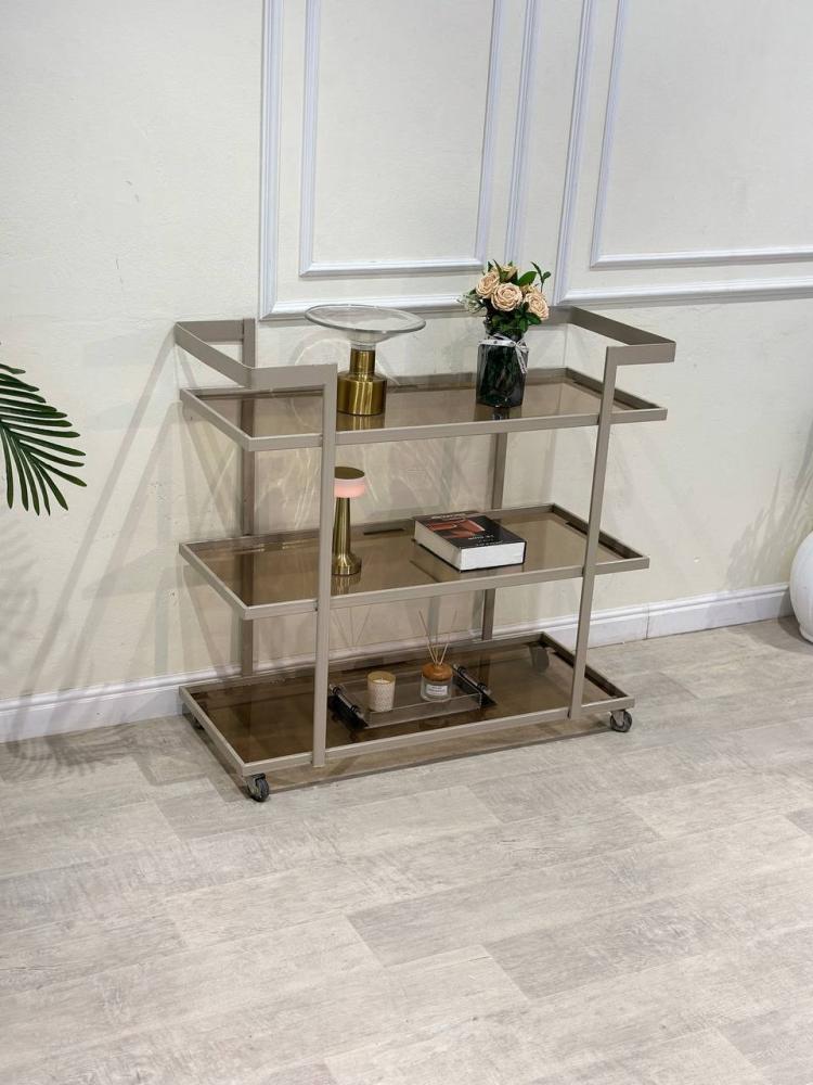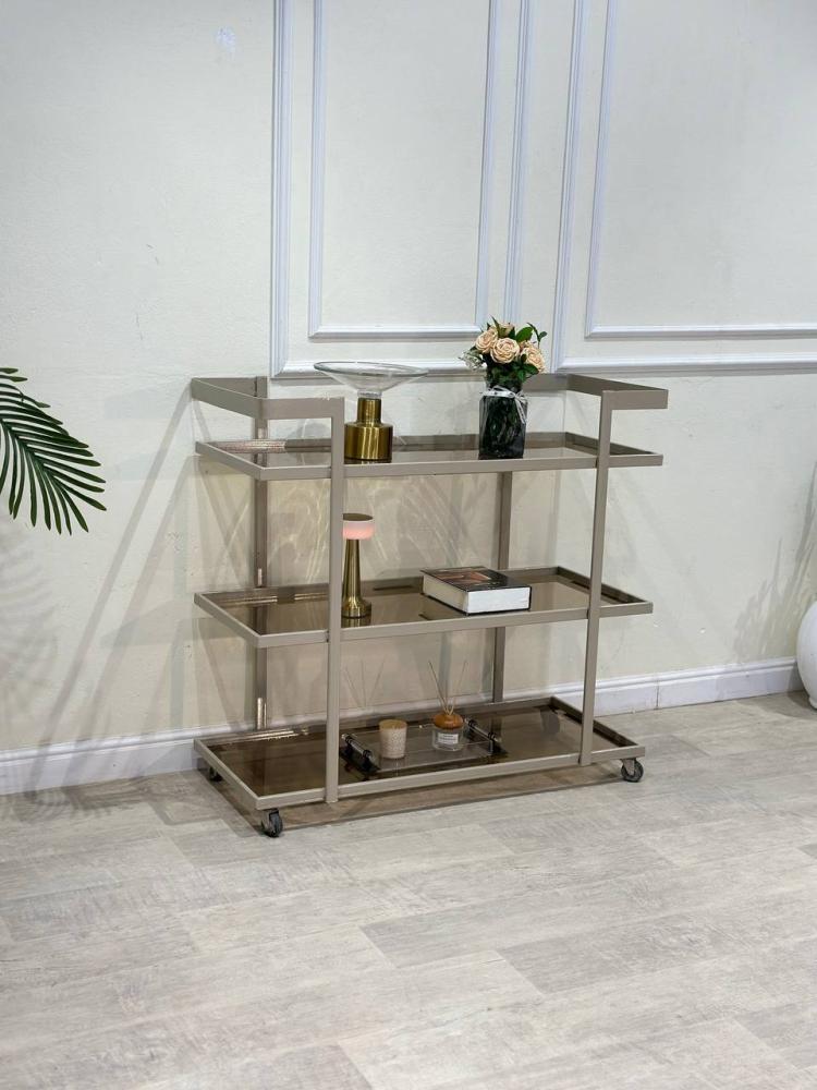 عربية تقديم ضيافة بثلاثة أدوار بتصميم فاخر وأنيق، تجمع بين فخامة اللون الشمباني وبريقه العصري مع سطح زجاج بني أنيق يضفي لمسة راقية على ديكور منزلك. تم تصميمها بعناية لتكون عملية وجذابة في نفس الوقت، مما يجعلها خيارًا مثاليًا لتقديم الضيافة بأسلوب يعكس الذوق الرفيع.