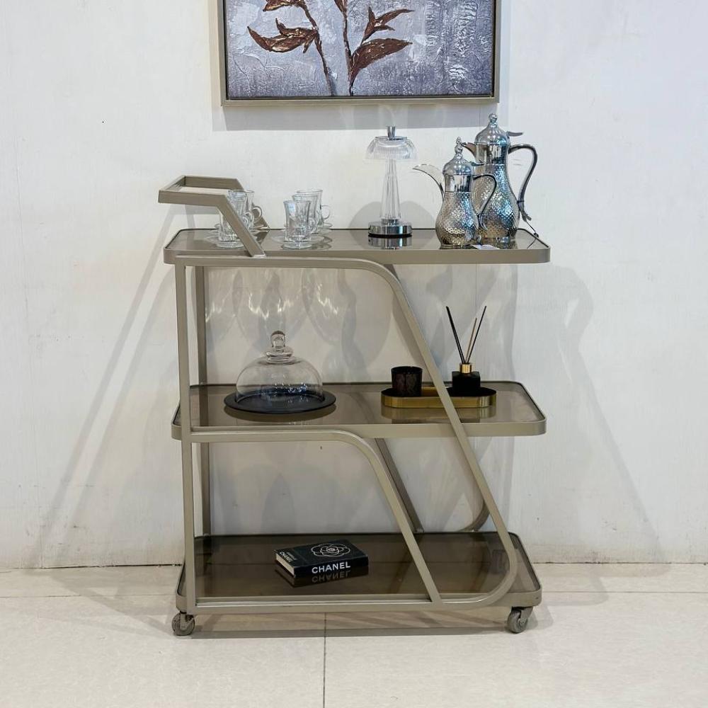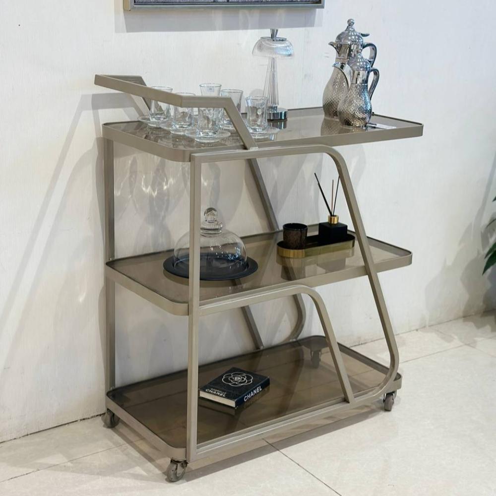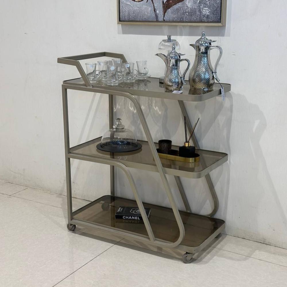 أضف لمسة من الأناقة والوظائف المتعددة إلى منزلك أو مكتبك مع عربية الثلاث طبقات بشكل السفينة وزجاجها البني الفاخر، التي تجمع بين التصميم العصري والجودة العالية لتوفير تجربة تخزين وعرض مميزة.