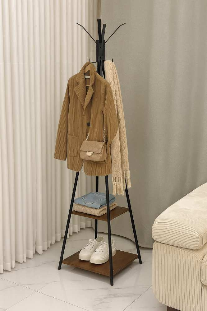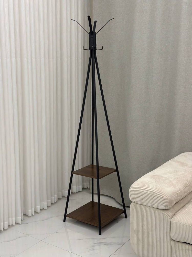 علاق ملابس دورين يجمع بين الخشب البني الفاخر والحديد الأسود المتين بتصميم أنيق يعكس الطابع العصري والعملي في آنٍ واحد. يتميز بتناسق الألوان بين الخشب الطبيعي والحديد الأسود ليمنح المكان لمسة من الفخامة والدفء في التصميم الداخلي.