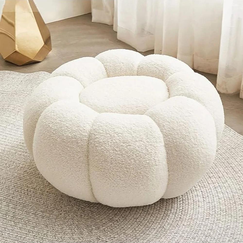 كرسي بوف بتصميم فريد على شكل وردة، مصنوع من قماش البوكلية المعروف بملمسه الناعم والمخملي. يتميز بالشكل الجمالي الانسيابي والفاخر، مما يجعله قطعة ديكور بحد ذاته، إضافة إلى كونه مريحًا للجلوس.