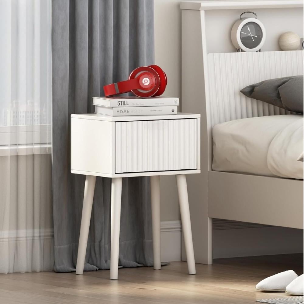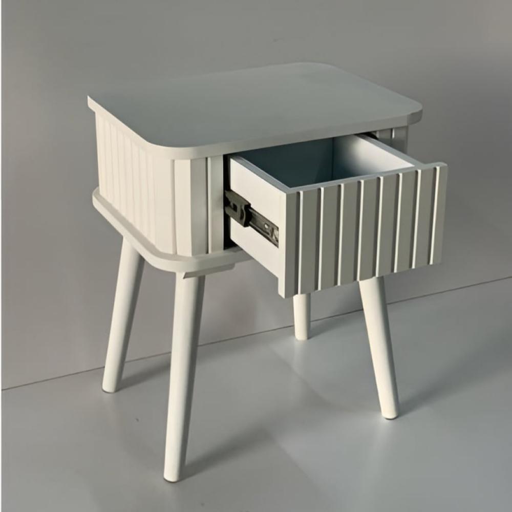 كومدينة خشب أبيض أنيقة بتصميم عصري بسيط، مصنوعة من خشب متين بلمسة نهائية ناعمة باللون الأبيض. تحتوي على درج واحد لتخزين الأغراض الصغيرة، مع سطح علوي مثالي لوضع مصباح، كتب، أو ديكور بسيط.