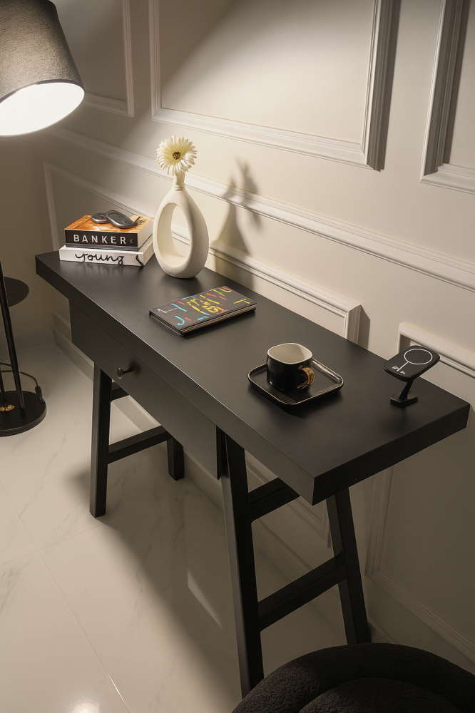 - سطح علوي واسع لوضع التحف، الزهور، أو مرآة جدارية فوقه.
