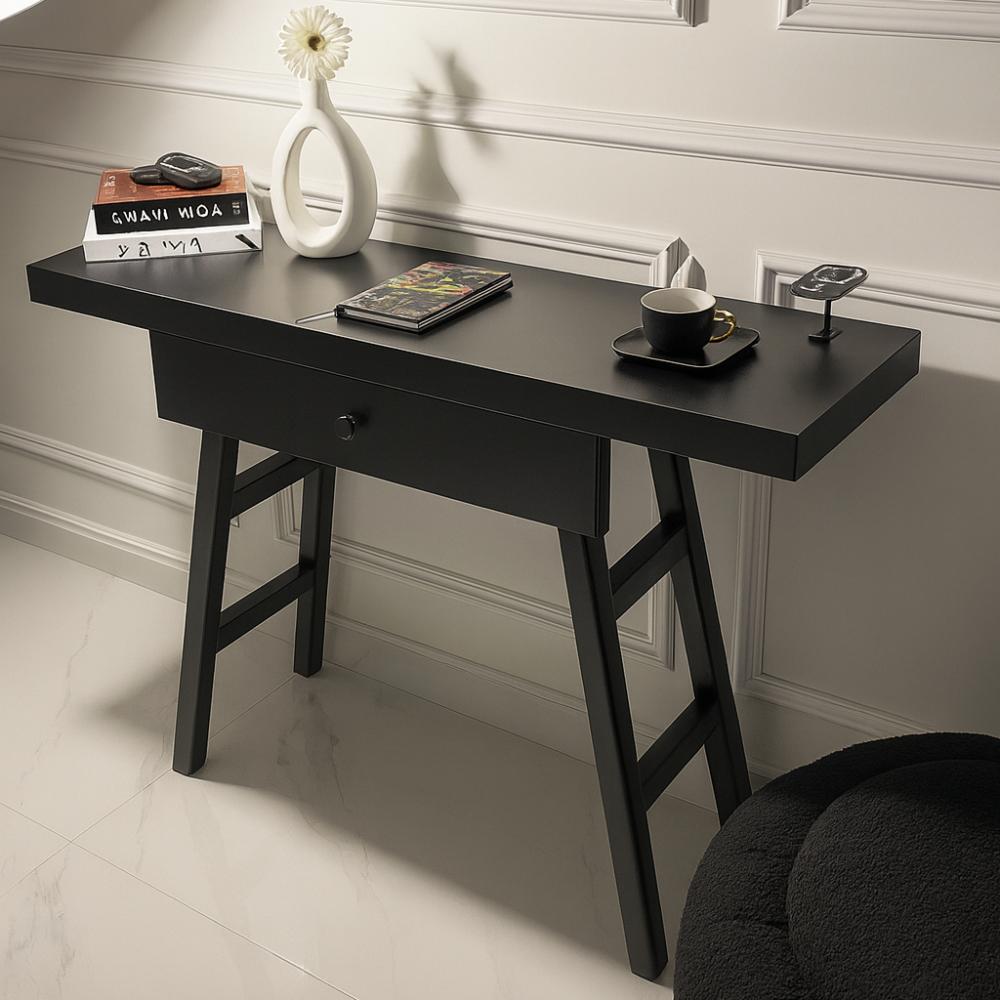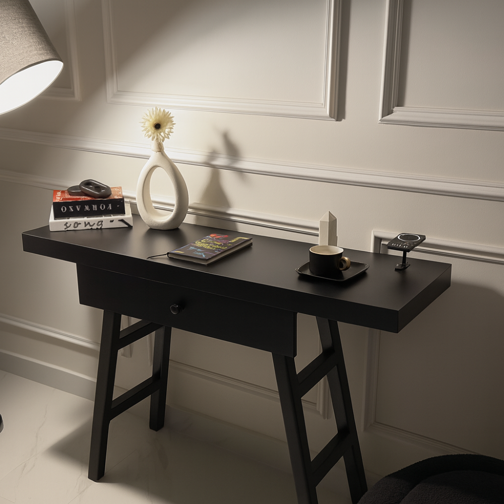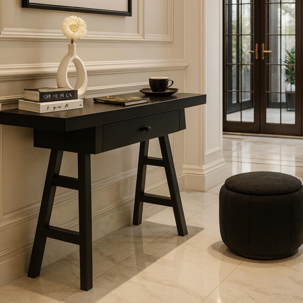 مدخل بتصميم عصري مصنوع من الخشب بلون أسود أنيق، مزود بدرج عملي لتخزين المستلزمات الصغيرة، مع سطح علوي مناسب لوضع الديكورات أو الاحتياجات اليومية.