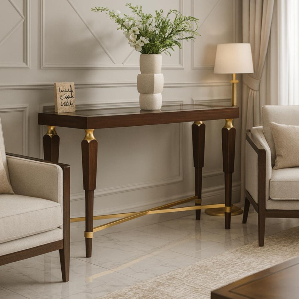 - يعتبر كنسول مدخل بني خشبي بسطح زجاج تصميم عصري ومميز يضفي لمسات من الأناقة على ديكور منزلك.