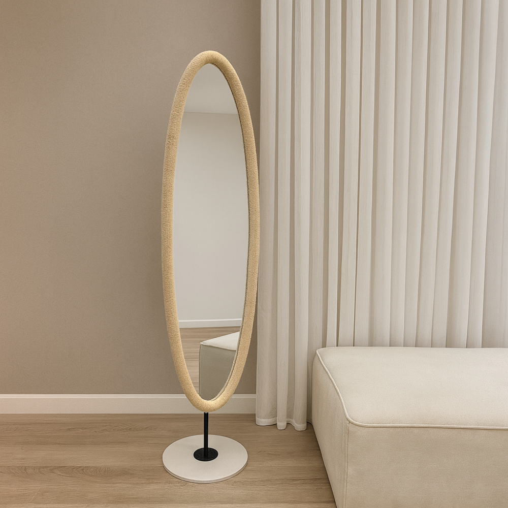 - مرآة بشكل بيضاوي مميزة من كافيني بإطار مغطى بالقماش باللون البيج، تجمع بين البساطة والفخامة. تصميمها الناعم يضفي لمسة دافئة وأناقة عصرية على أي مساحة.